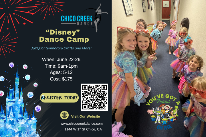 Disney Dance Camp Monday, June 22, 2026 9:00 AM Friday, June 26, 2026 1:00 AM Chico Center for the Arts 1144 West 1st Street Chico, CA, 95928 United States (map) Google Calendar ICS Purchase Tickets